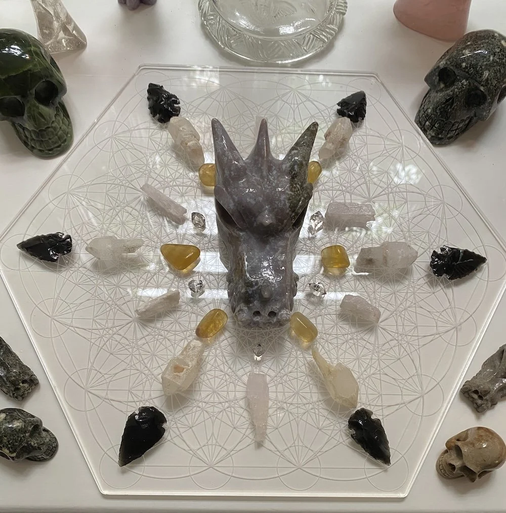 At the centre of this crystal grid is a beautiful Moss Agate Dragon. Some of you have seen this beauty before in photographs of our Sacred Journey in England and Wales in September 2023.